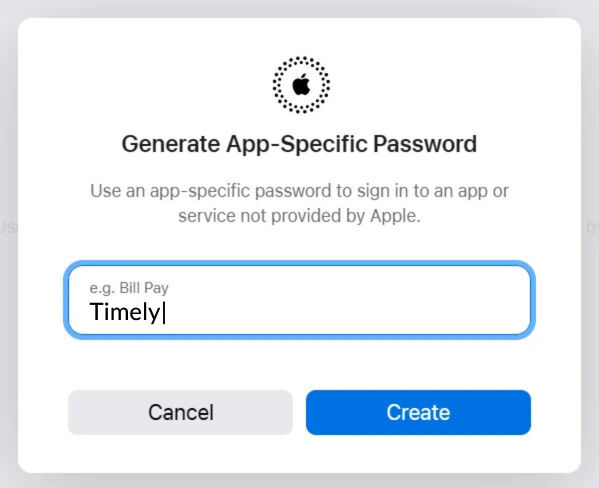 Before enabling Apple Calendar in Timely, your Apple account needs to have the 2FA (2-Factor Authentication) configured, and an App-Specific Password created.