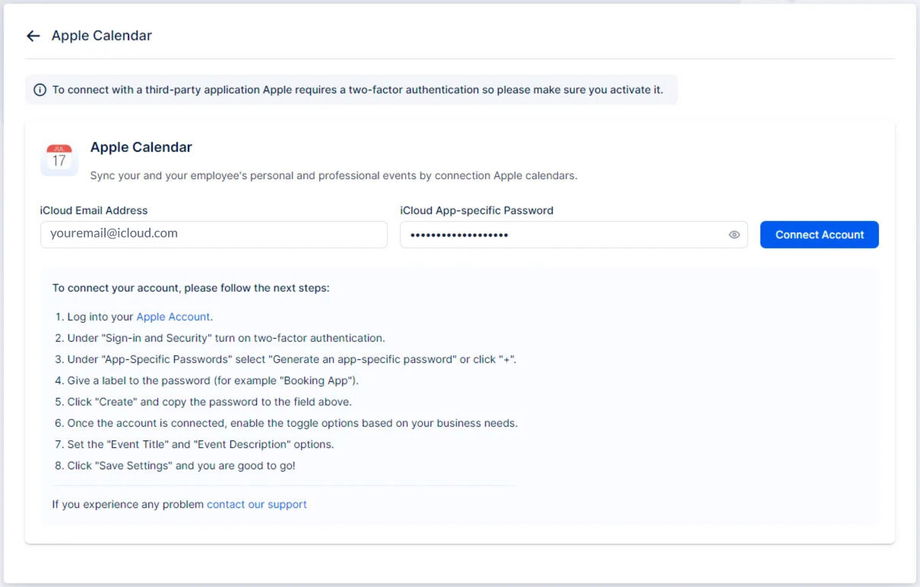 Once you access the configuration screen for Apple Calendar, you will simply enter your email address and the App-Specific Password you previously created.